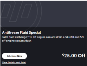Plus tax, shop supplies and hazardous waste removal where applicable. Refill covers up to one gallon of coolant. Cannot be combined with any other offers. Must present coupon at time of write up. See Service Advisor for complete details.