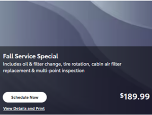 Pricing may vary by model. Plus tax, shop supplies and hazardous waste removal where applicable. Cannot be combined with any other offers. Must present coupon at time of write-up. See Service Advisor for complete details.